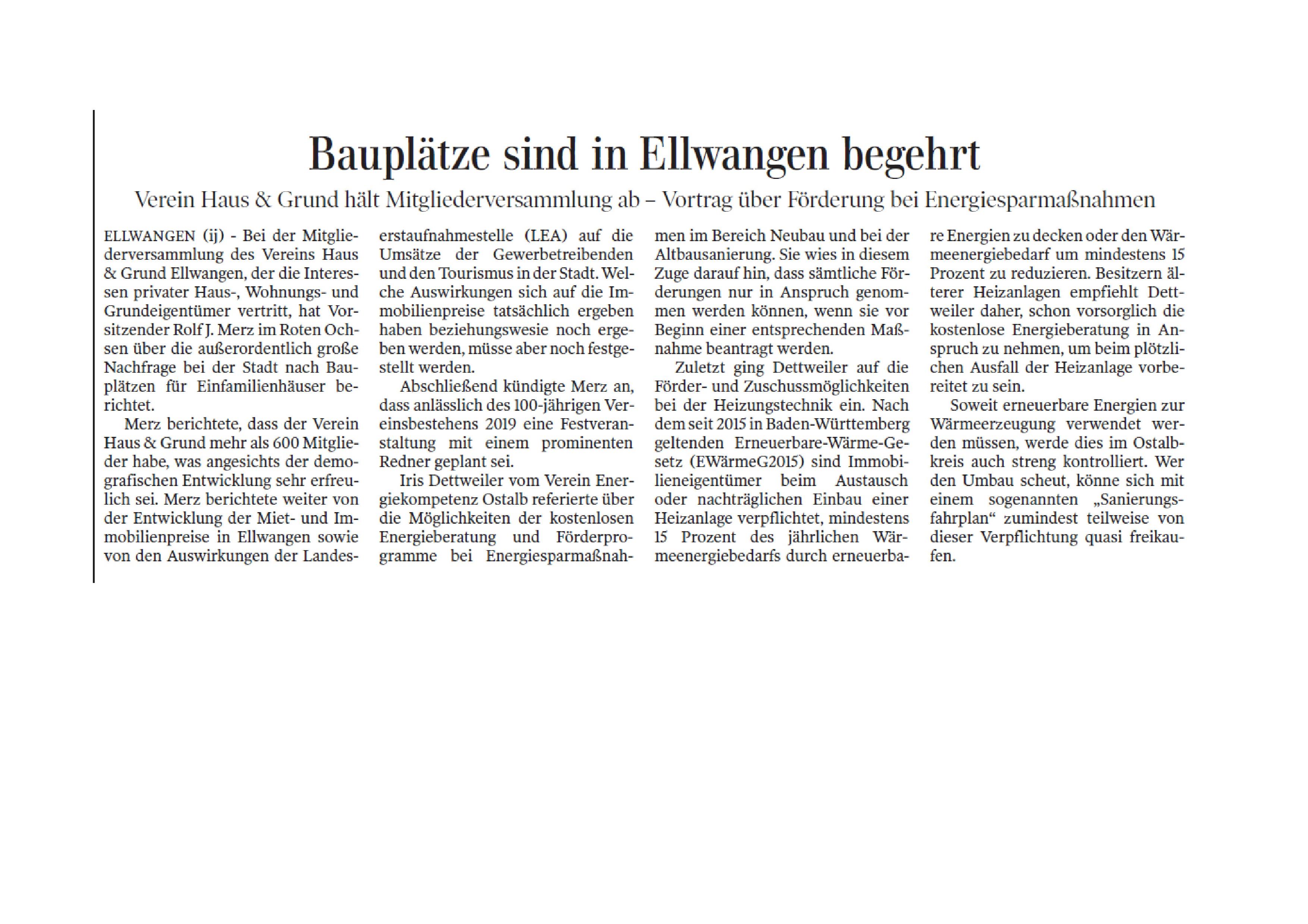 Artikel "Bauplätze sind in Ellwangen begehrt"